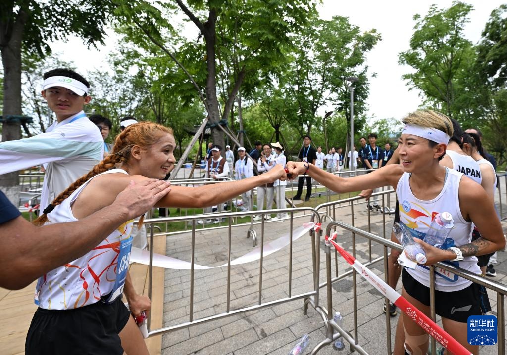 8月11日,中国队第一棒选手郝双燕(左)与队友刘晓明在比赛中交接。最终,中国队位列第12名。