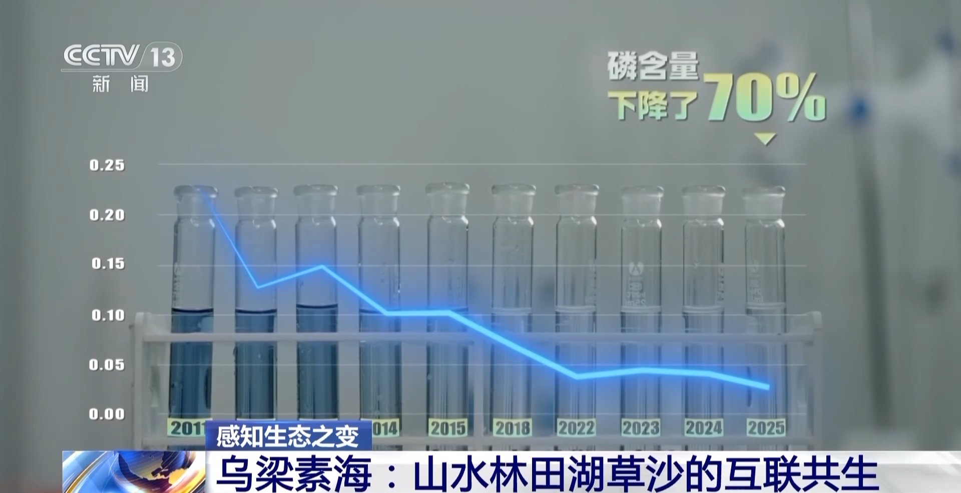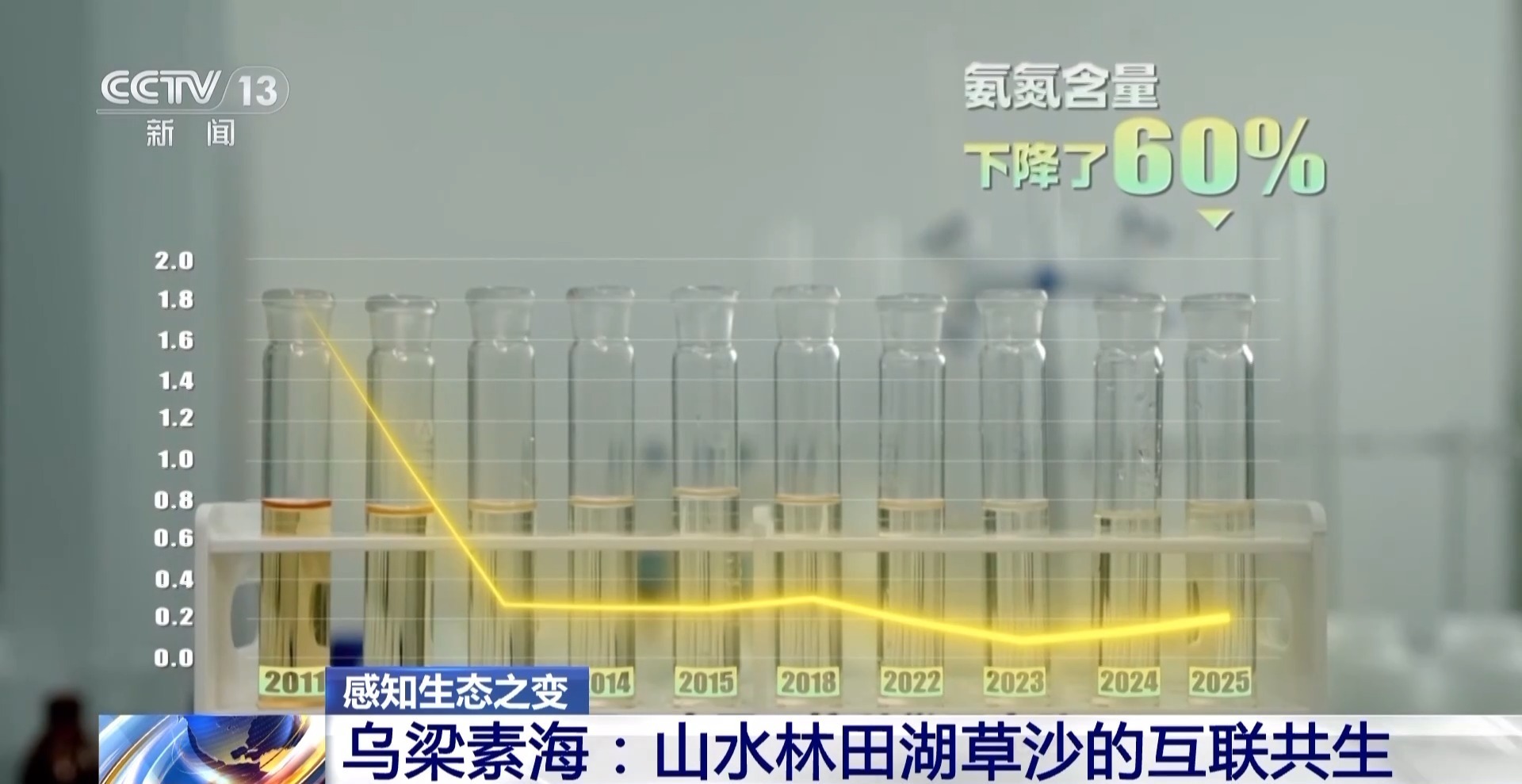 从颜色深浅中,能直观感受到水质的改变。从2011年到2025年,乌梁素海的氨氮浓度下降了60%,磷含量下降了70%。