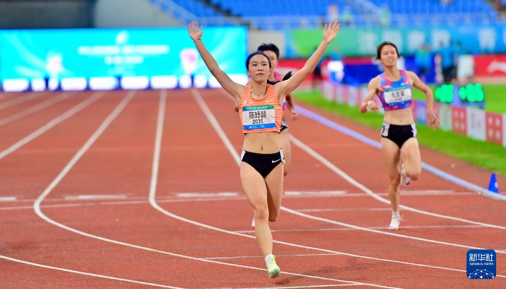 8月11日,浙江队选手陈妤颉(前)在冲线后庆祝。她获得冠军。