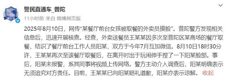 11日晚,@警民直通车_普陀发布通报称,8月10日,网传“某餐厅前台女孩被取餐的外卖员摸脸”。普陀警方发现相关信息后,迅速开展核查。经查,外卖送餐员王某某因多次至普陀区某商场的餐厅取餐,结识了餐厅前台工作人员阳某,双方于今年7月互加微信。8月10日18时30分许,王某某再次至该餐厅取餐后,在离开时出于玩闹伸手捏了一下阳某脸部。事后,阳某未报警,系其同事将视频上传网络。警方主动介入调查后,阳某明确表示无须追究对方责任。目前,王某某已向阳某赔礼道歉,阳某亦表示谅解。