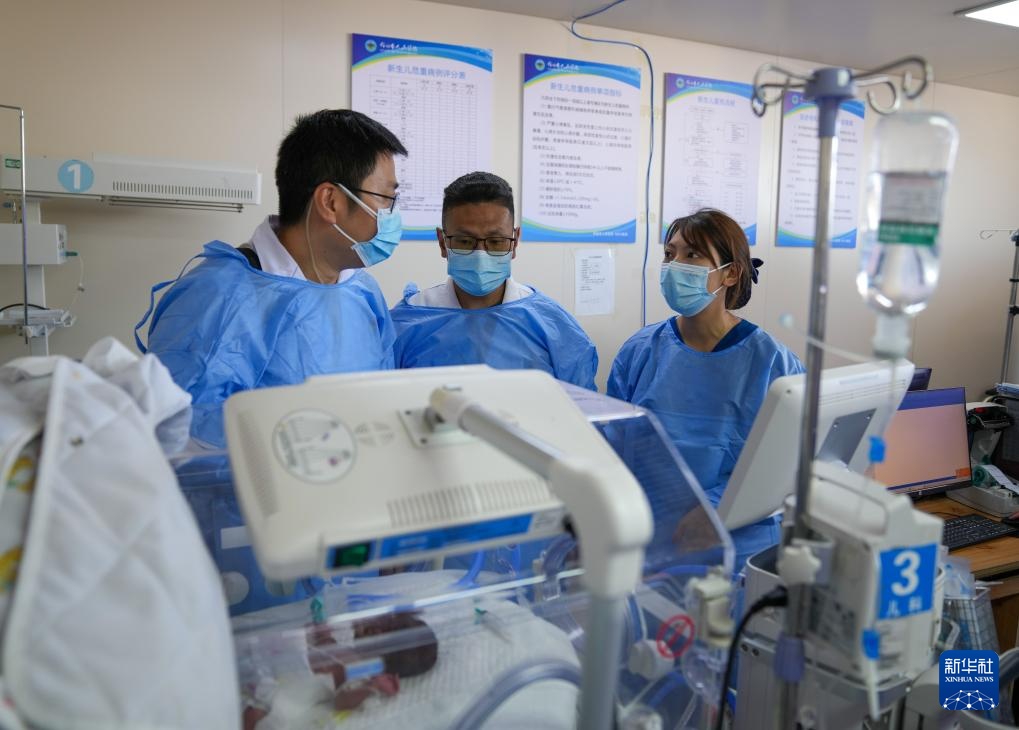在那曲市人民医院新生儿重症监护室,来自大连医科大学附属第一医院的援藏医生田聪亮(左)与吉美多布杰(中)、护士旦珍合作,为一名早产儿实施机械通气治疗(7月18日摄)。吉美多布杰2003年从四川大学华西医学院毕业来到那曲市人民医院工作,他先后和8批援藏专家合作、学习。