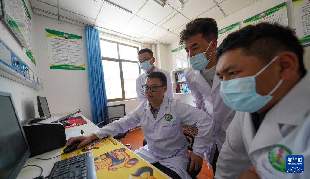 福建省泉州市惠安县医院援藏外科医生张聪林(左二)和安溪县医院援藏外科医生郑毓能(左一)在和西藏昌都市洛隆县医院医生巴桑扎西(右二)和格桑多布杰(右一)商讨患者病情。