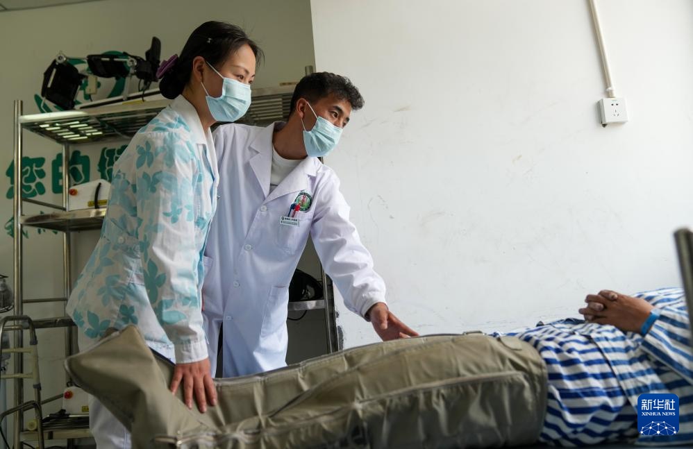 在昌都市洛隆县人民医院,从西藏大学医学院毕业的医生巴桑扎西和护士为患者进行康复治疗(7月21日摄)。