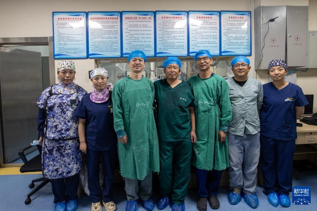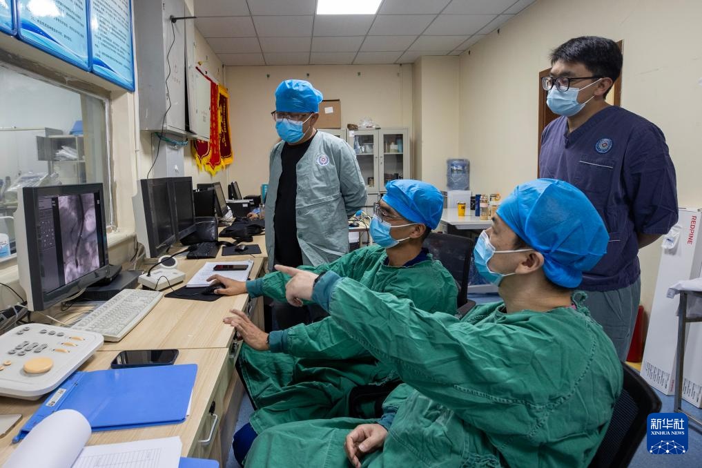 协和医院第十批援藏医生王强(左四)、第十一批援藏医生蒋青伟(左三)和西藏自治区人民医院医生扎西(左一)在拉萨为患者施行内镜逆行胰胆管造影术(8月5日摄)。