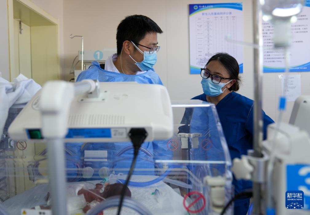 在那曲市人民医院新生儿重症监护室,来自大连医科大学附属第一医院的援藏医生田聪亮(左)和护士旦珍合作为一名早产儿实施机械通气治疗(7月18日摄)。
