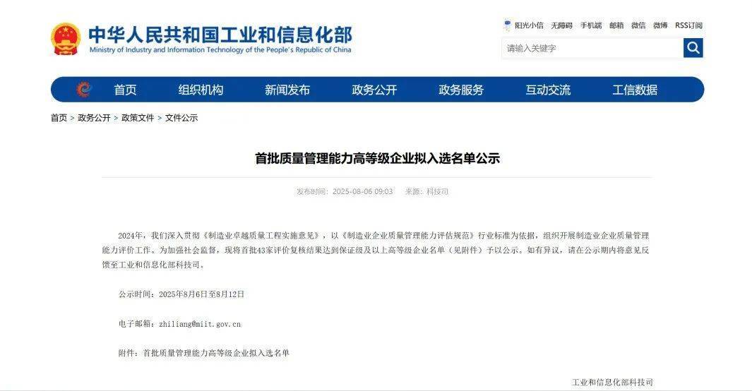 湖北日报讯(记者张真真)近日,工业和信息化部发布首批“质量管理能力高等级企业”公示名单,全国共43家企业入围。