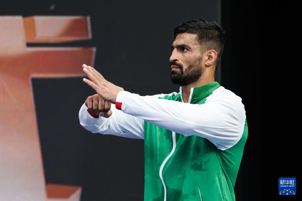 8月12日,埃及选手阿尔侯赛因(左)与伊朗选手穆罕默德礼萨在比赛中。