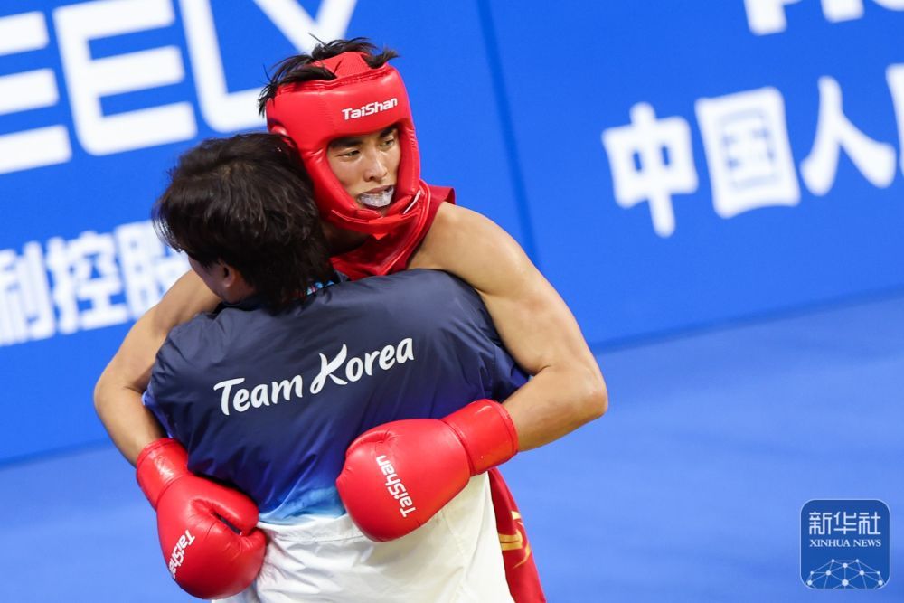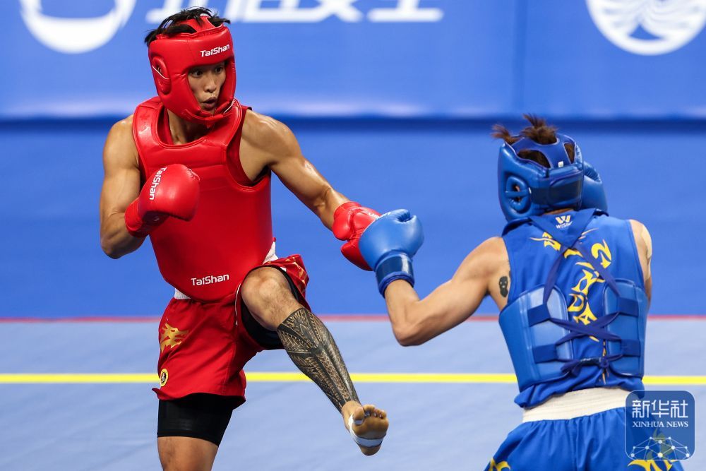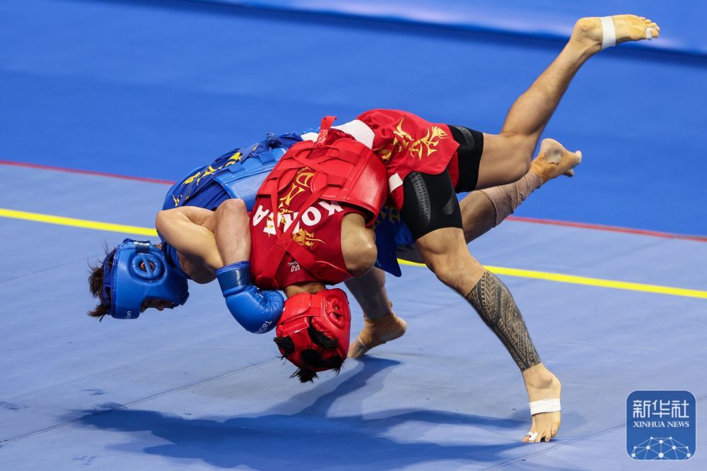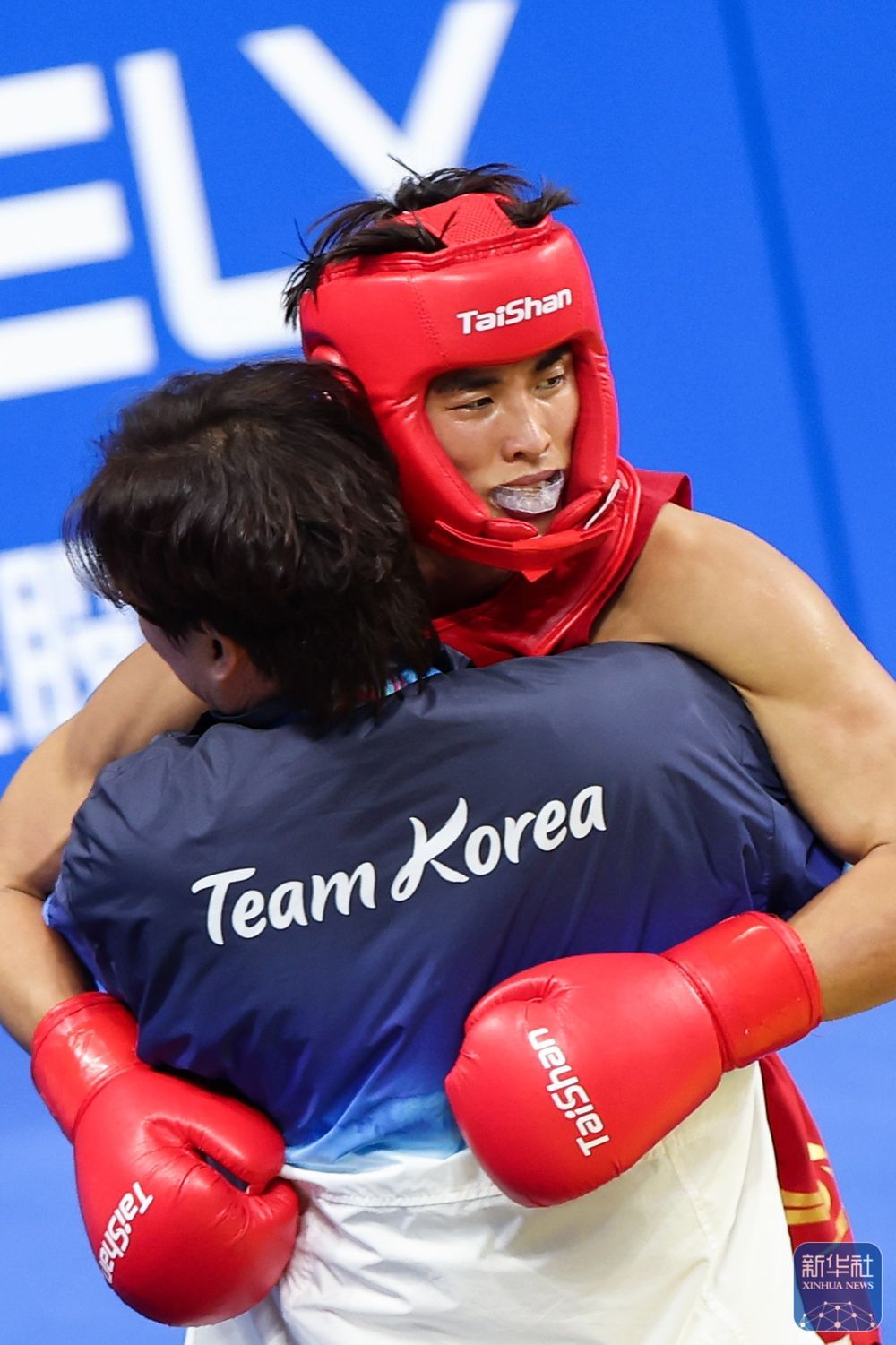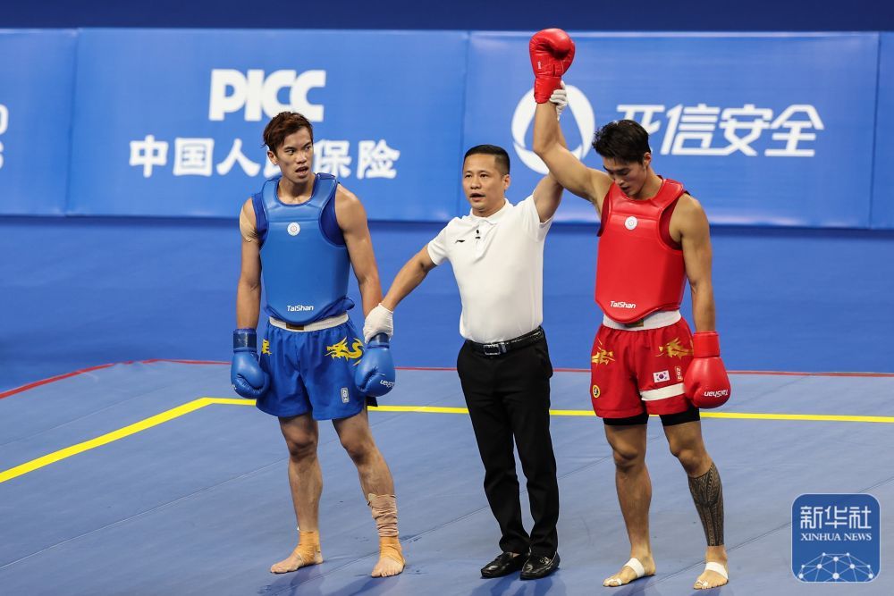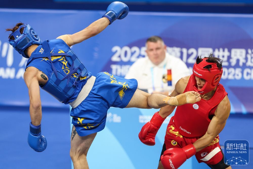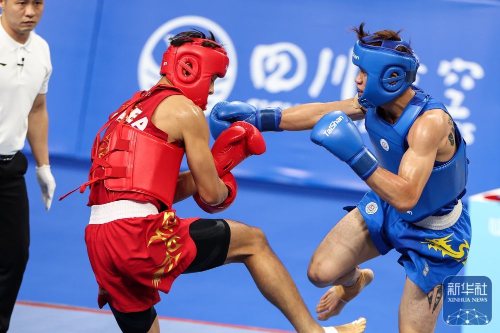 当地时间8月12日,在2025年成都世运会武术男子散打70公斤级金牌赛中,韩国选手宋起哲战胜中国香港选手张溢霖,获得冠军。