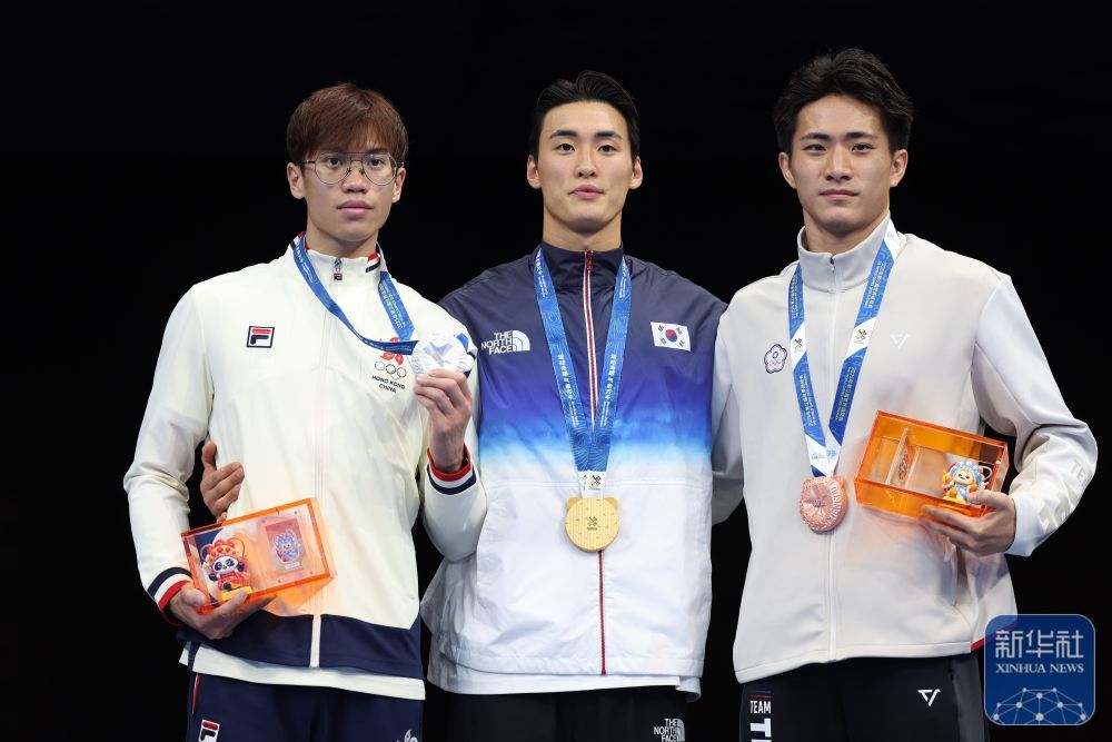↑ 冠军韩国选手宋起哲(音、中)、亚军中国香港选手张溢霖(左)和季军中国台北选手张焕宜在领奖台上合影。