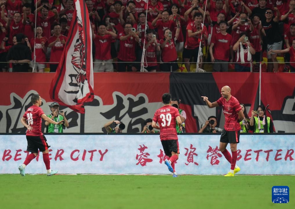 8月12日,成都蓉城队球员费利佩(左二)在比赛中射门得分。