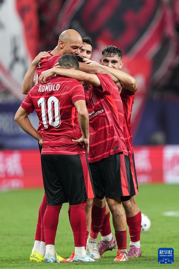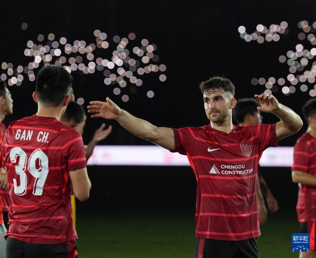8月12日,成都蓉城队球员在比赛中庆祝进球。