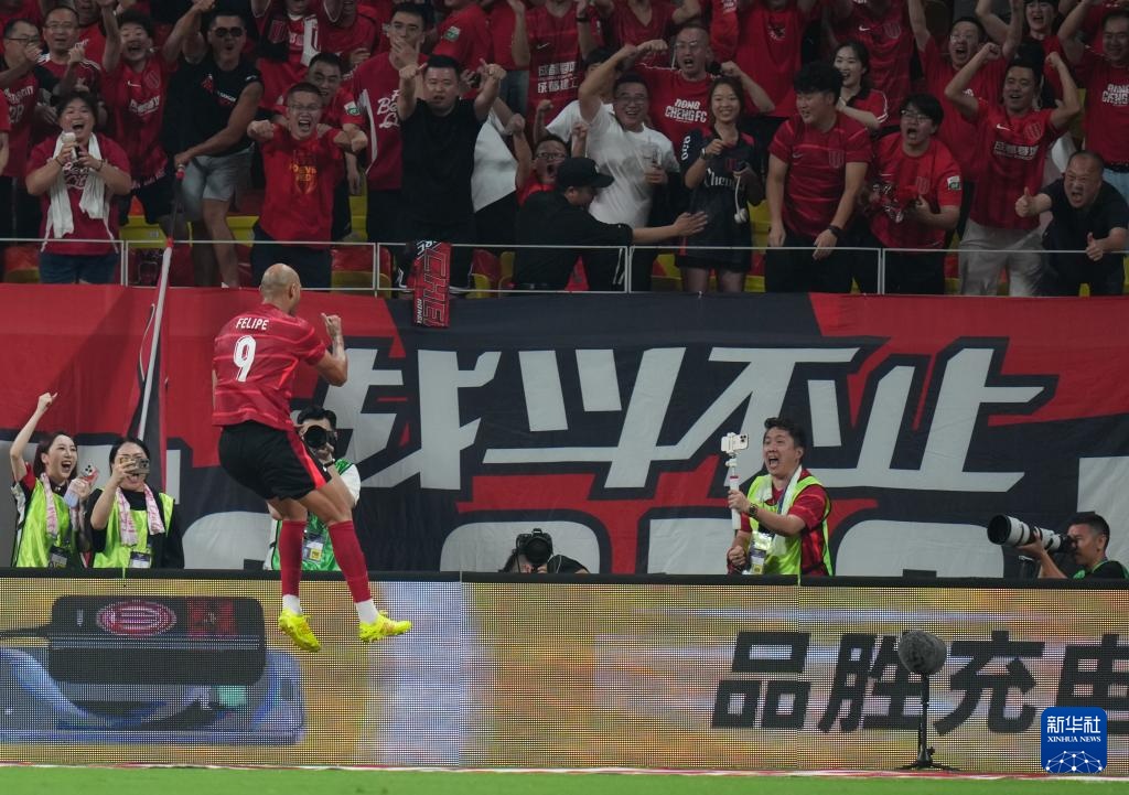 8月12日,成都蓉城队球员费利佩在进球后庆祝。