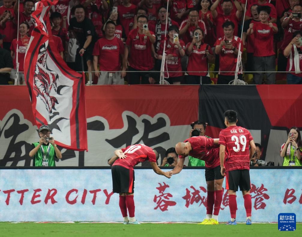 8月12日,成都蓉城队球员费利佩(右)进球后与队友庆祝。