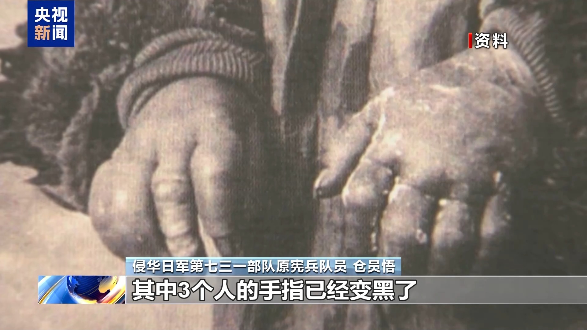 侵华日军第七三一部队原宪兵队员 仓员悟:我是1940年12月看到的,我向吉村提出想看一看,就到监狱的研究室去了,进入研究室后,看到有5名中国人坐在长椅上,其中3个人的手指已经变黑了,而且断掉了。另外2个人的手指也都变黑了,只剩下了骨头。吉村解释说,这是冻伤实验的结果。