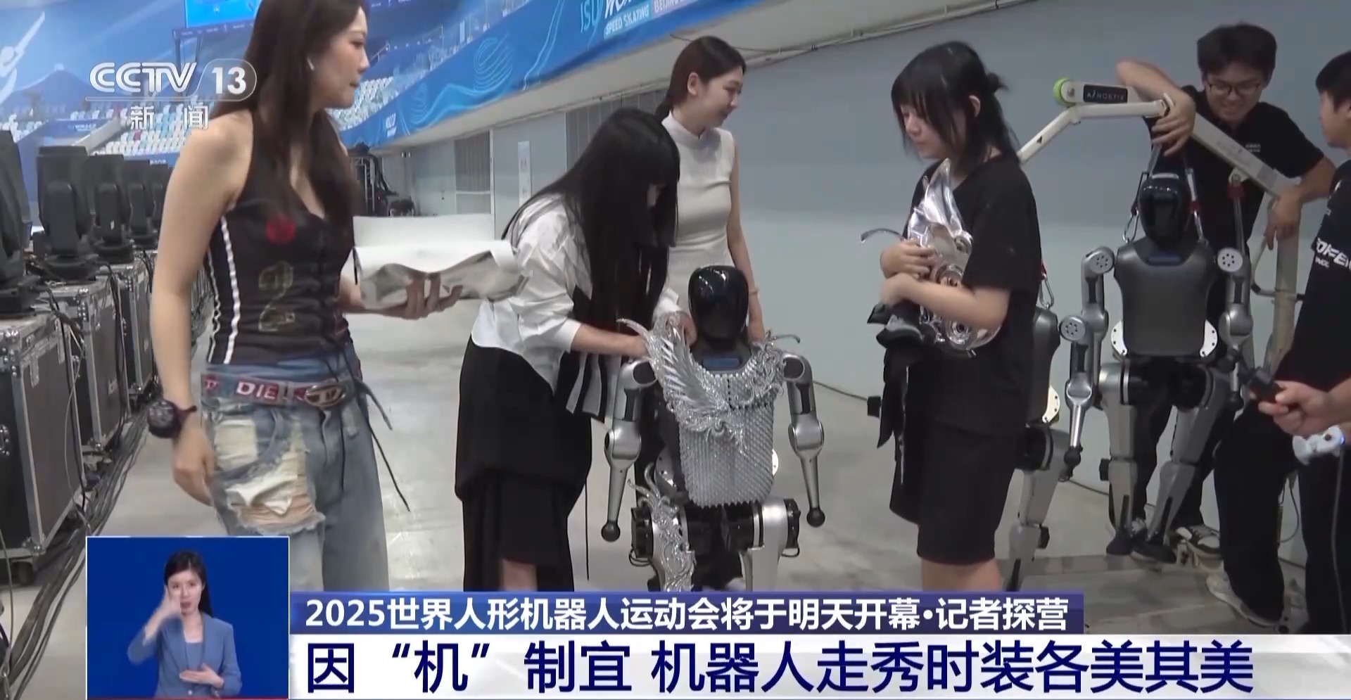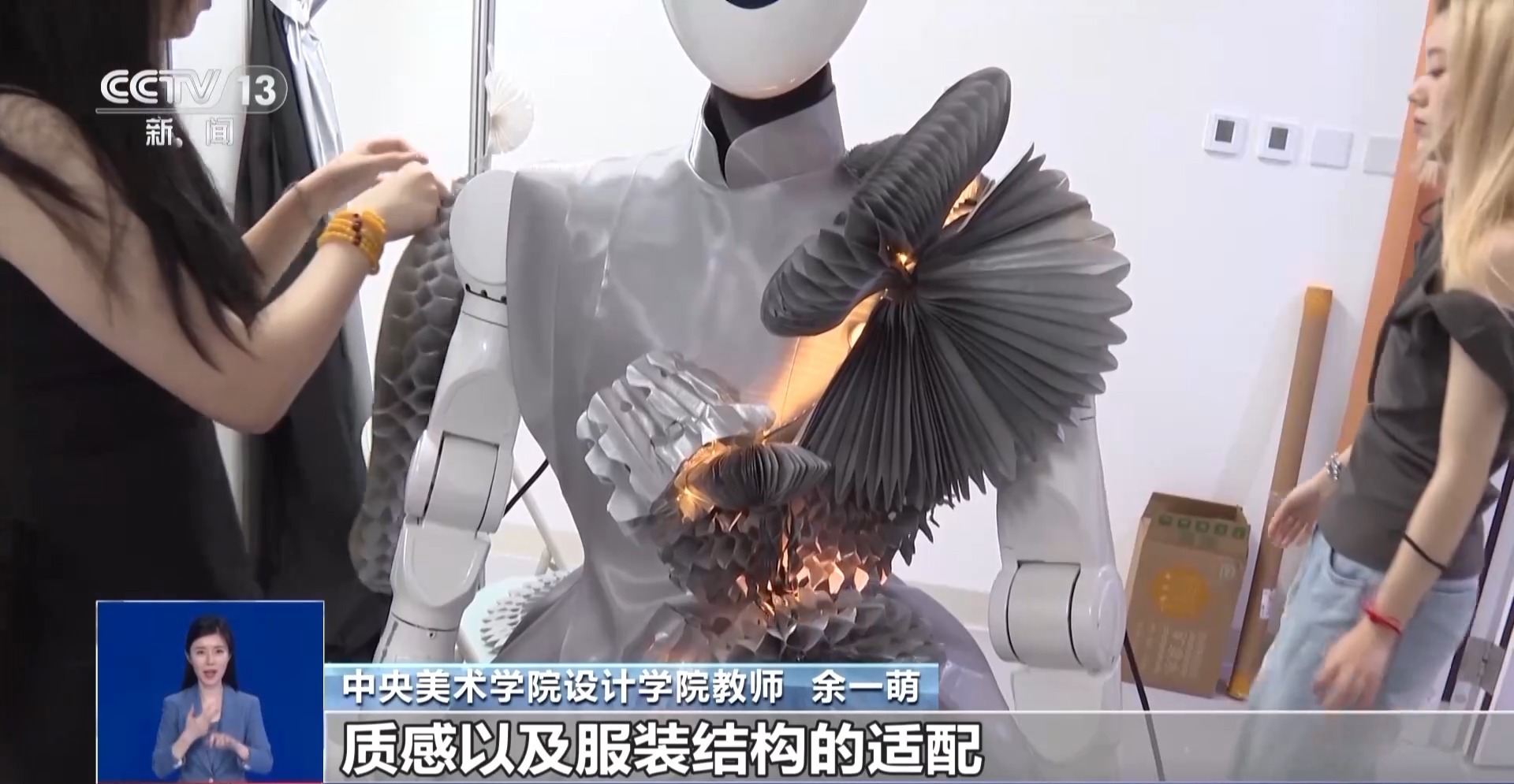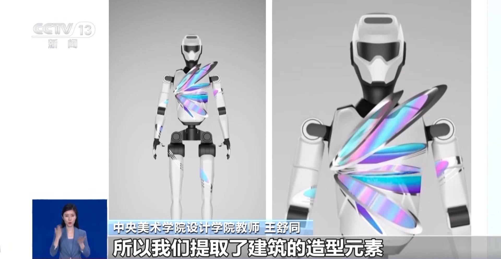 中央美术学院设计学院教师 余一萌:我们在对所有机器人进行设计的时候,优先从机器人本身的外观和身体结构进行考虑,针对性地避开一些部位,比如散热部位、关节部位,同时也会针对机器人的外壳来进行相应色彩、质感以及服装结构的适配。