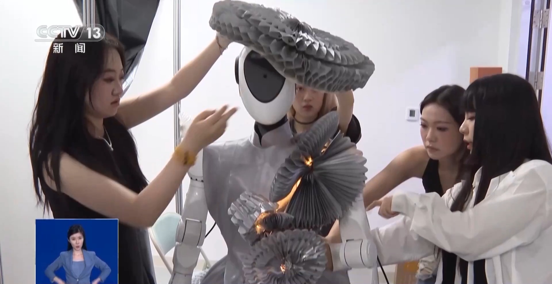 在服装制作的工作室,记者发现了一件为走秀机器人设计的唯一一款全身裙装,画面中可以看到这条裙子采用了中式立领设计和花瓣造型大裙摆,通过机械装置和灯光晕染呈现出灵动的翻花造型,非常挺括优雅。