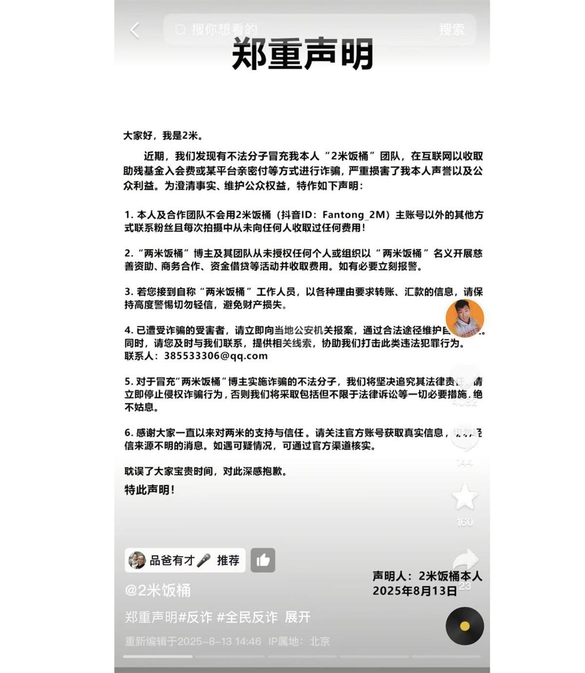 极目新闻记者注意到,博主“2米饭桶”也看到了这件事情,并在尹先生的视频下评论,提醒网友谨防上当受骗并对此事件表示抱歉。该博主还在自己的账号发布声明,对于冒充其实施诈骗的不法分子,该博主及其团队表示将坚决追究其法律责任。