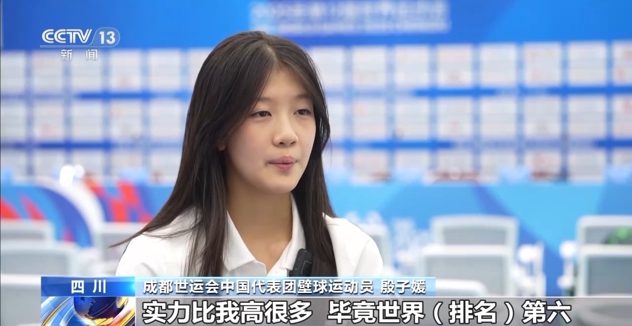成都世运会中国代表团壁球运动员 殷子媛:国际象棋要一步步布局,壁球也是,从发球开始就要去布局下一步。比如说你发完球,她接完这个球之后,你下一步要怎么打,这个球战略是怎么取胜。它有趣的点就是比赛中,你的策略要改变,然后必须去想你的战术。