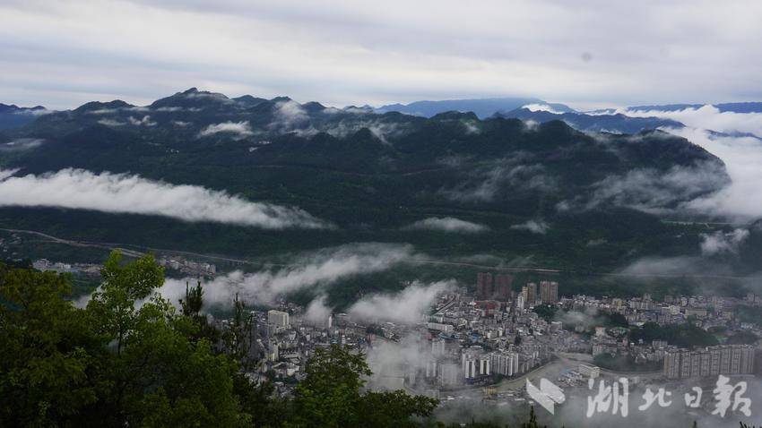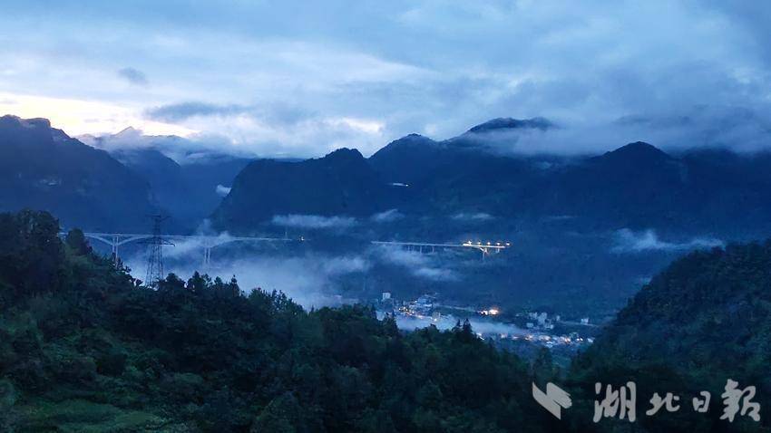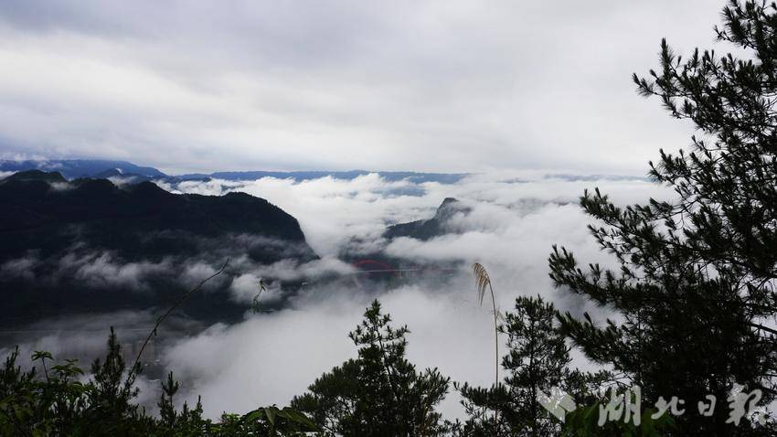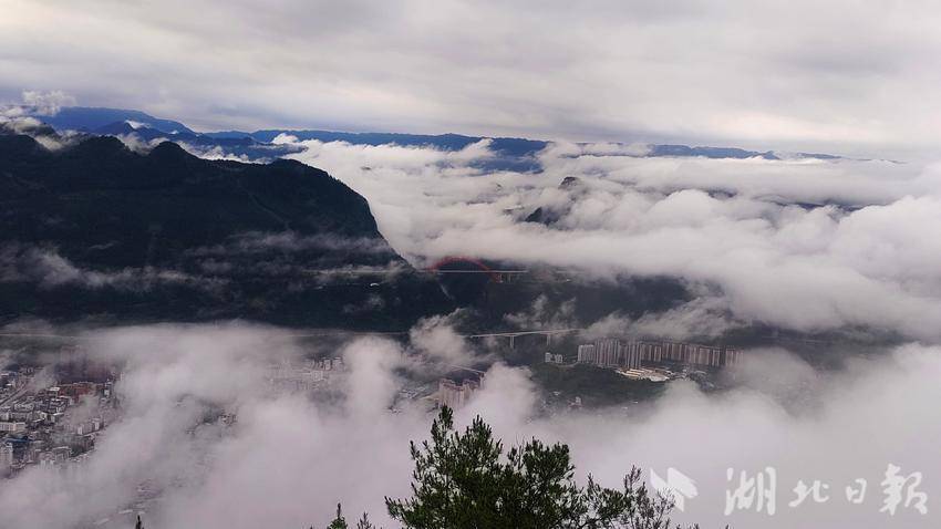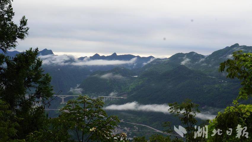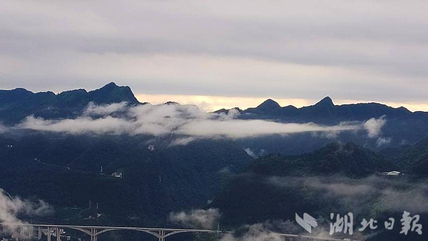 随着雾气的散开,高速大桥与容美山城渐渐从朦胧中探出轮廓,若隐若现,海市蜃楼般的虚幻。八峰山在雾中宛如天边散花的仙女,身姿婀娜,带着几分空灵与超凡。而雨后的溇水河,似一条淡黄的丝带,在晨雾的轻抚下,泛着柔和的光泽。