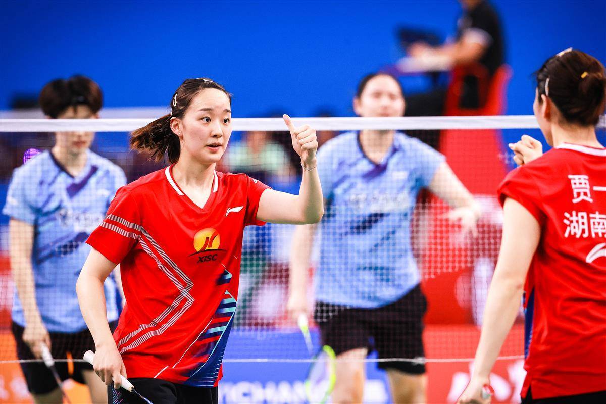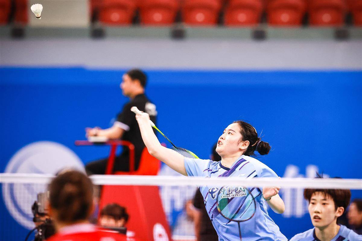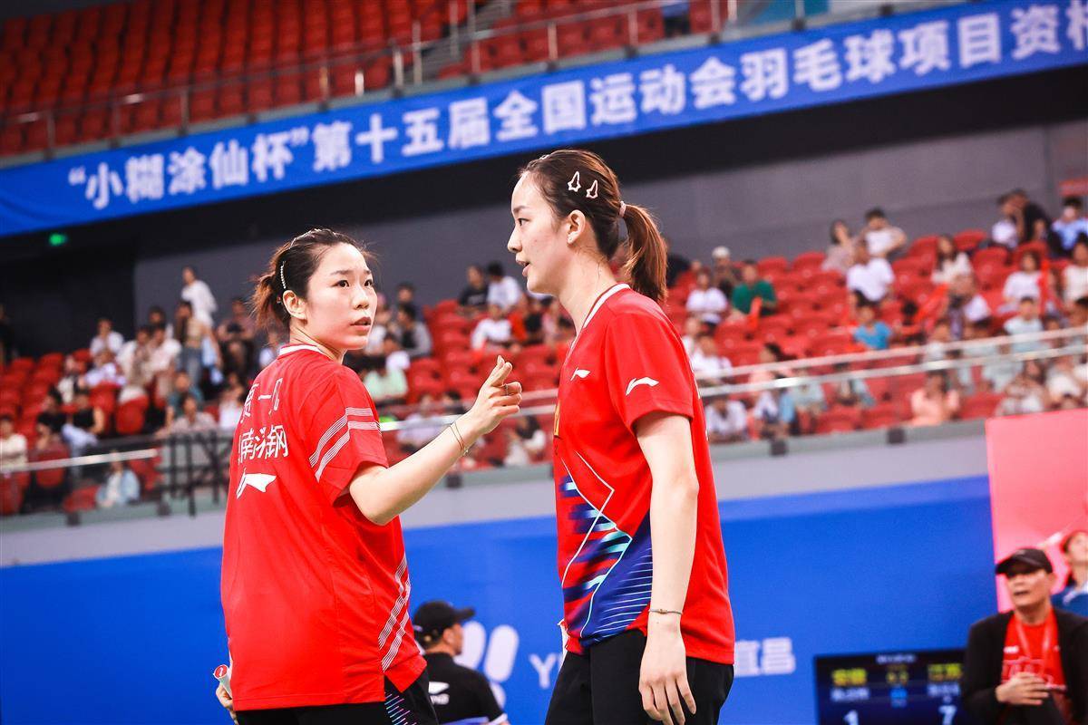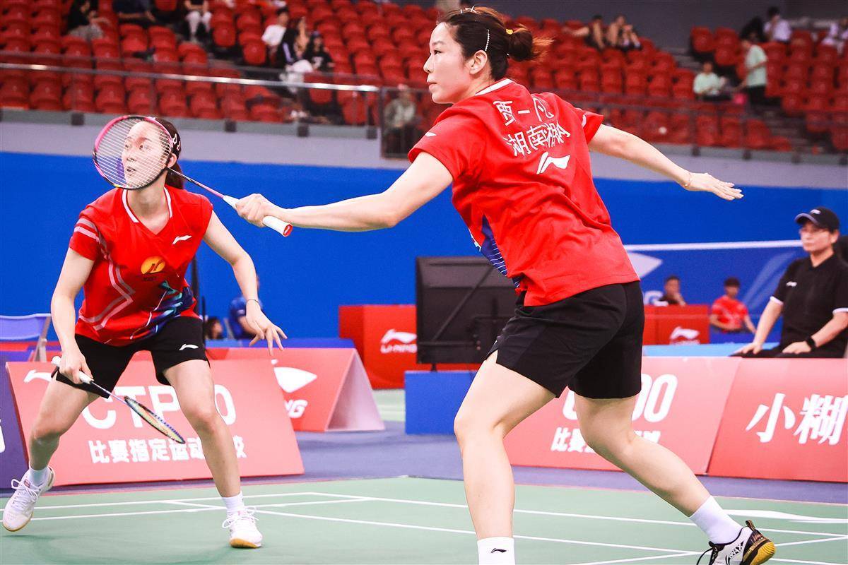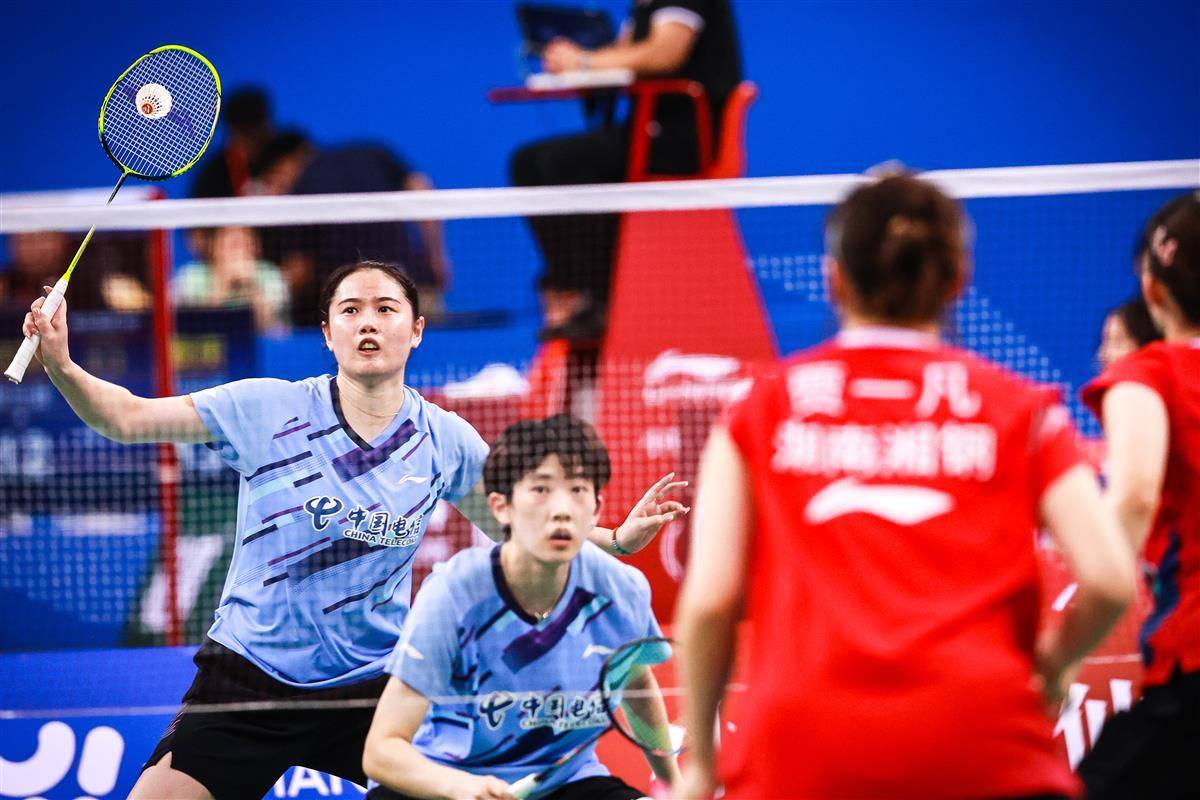 8月14日,十五运羽毛球资格赛在宜昌奥体继续进行,在当晚一场成年组女团焦点比赛中,代表湖南出战的奥运冠军贾一凡携手小将张驰,以2比1(16-21、21-12、26-24)逆转国家队队友、四川组合郑雨/张殊贤。中国羽毛球协会主席张军、奥运冠军谌龙等众多羽毛球名宿现场观赛。(湖北日报全媒记者 时龚 摄)