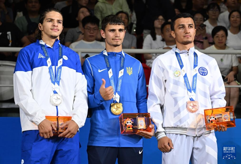 8月14日,冠军乌克兰选手马祖尔(中)、亚军阿塞拜疆选手古利耶夫(左)与季军乌兹别克斯坦选手阿西尔别克在颁奖仪式上。
