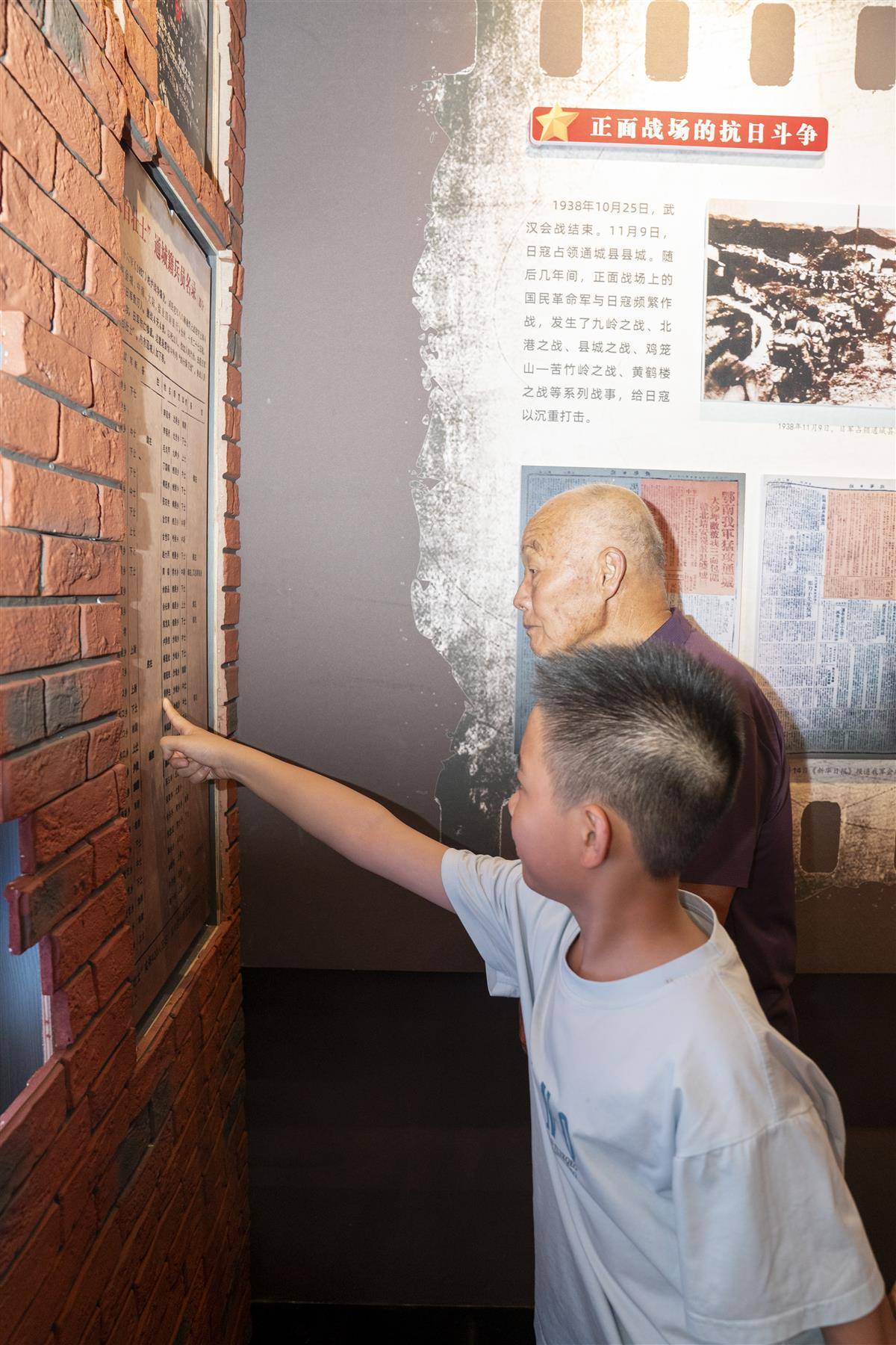 胡战平和孙子在八百壮士史料展板上寻找父亲胡梦生的名字。(湖北日报全媒记者 魏铼)