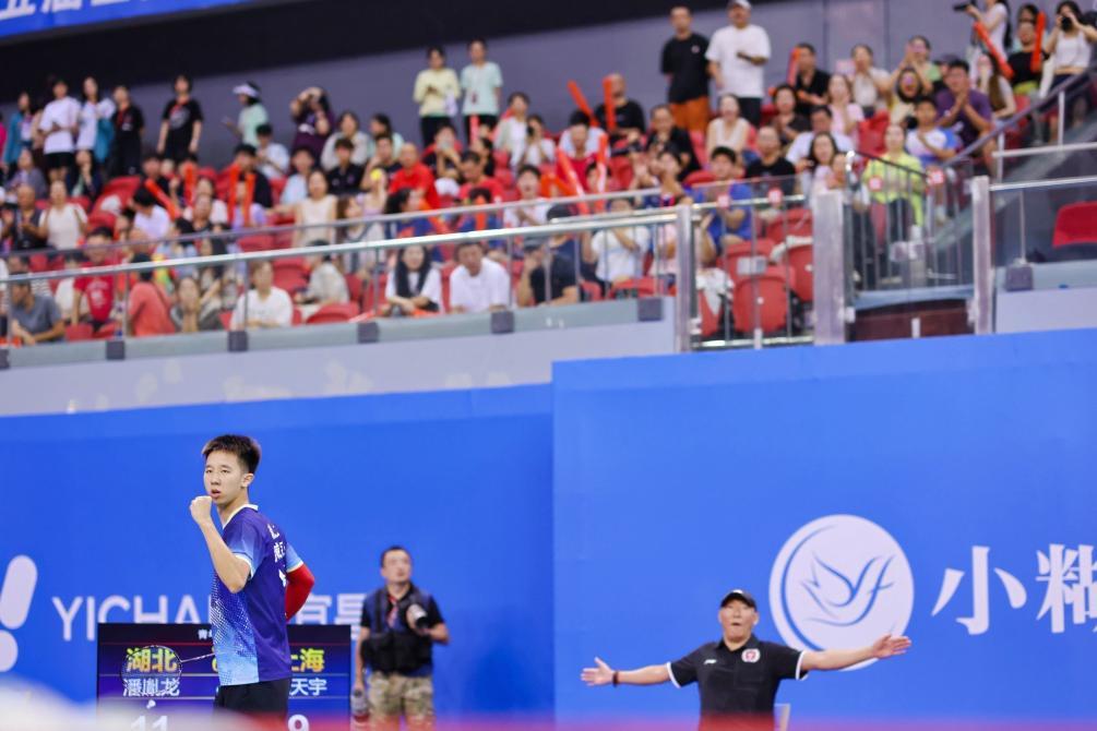 8月14日,湖北队潘胤龙在青年男团比赛中庆祝得分。(组委会供图)