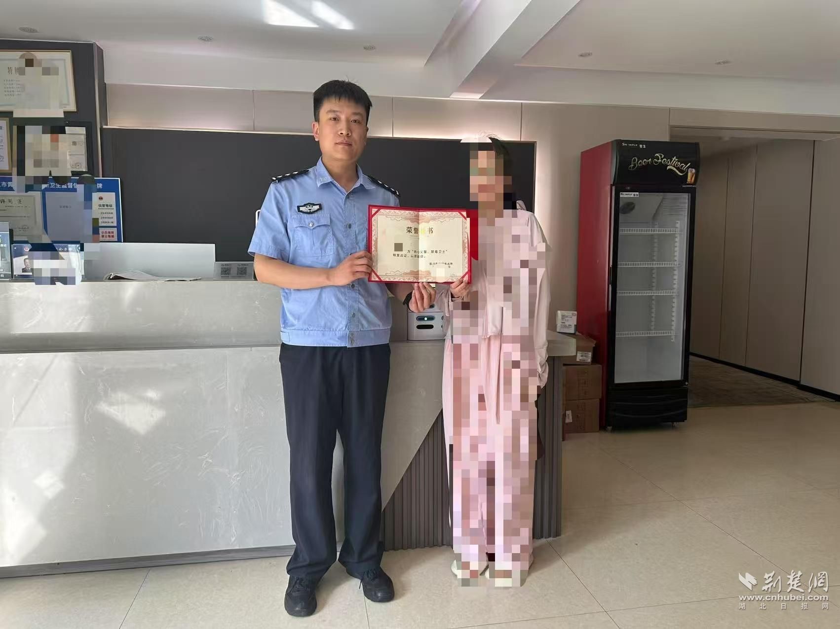 6月29日,义警成员李女士发现其供职的酒店垃圾桶内有多个带奶油气味的银色金属罐,顿觉心中一惊,当即拍照将信息报送在“环城义警”小程序上。民警蔡靳立马赶到现场,果然在酒店房间里抓获了吸食“笑气”的曾某、程某。两天后,环城所向李女士颁发“禁毒卫士”证书。李女士表示:“现在巡逻时看到异常瓶罐都会留个心眼,这些知识都是加入义警团队学到的真本领。”