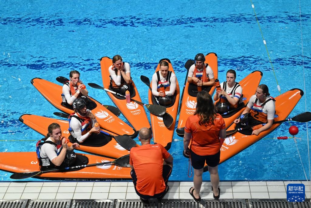 8月15日,荷兰队球员在中场休息时接受教练员指导。
