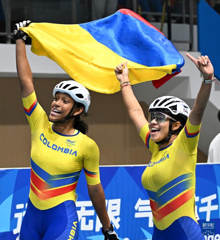 8月15日,哥伦比亚选手蒂姆斯·阿里萨(左)和队友鲁埃达庆祝胜利。