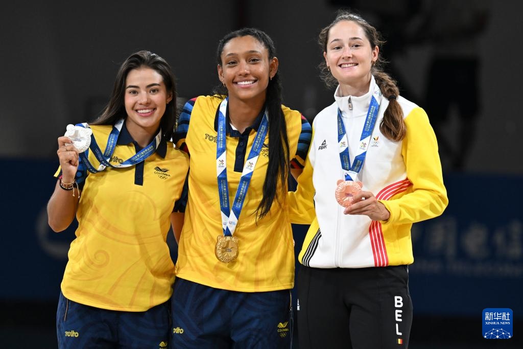 8月15日,冠军哥伦比亚选手蒂姆斯·阿里萨(中)、亚军哥伦比亚选手鲁埃达(左)和季军比利时选手瓦努特在颁奖仪式上。