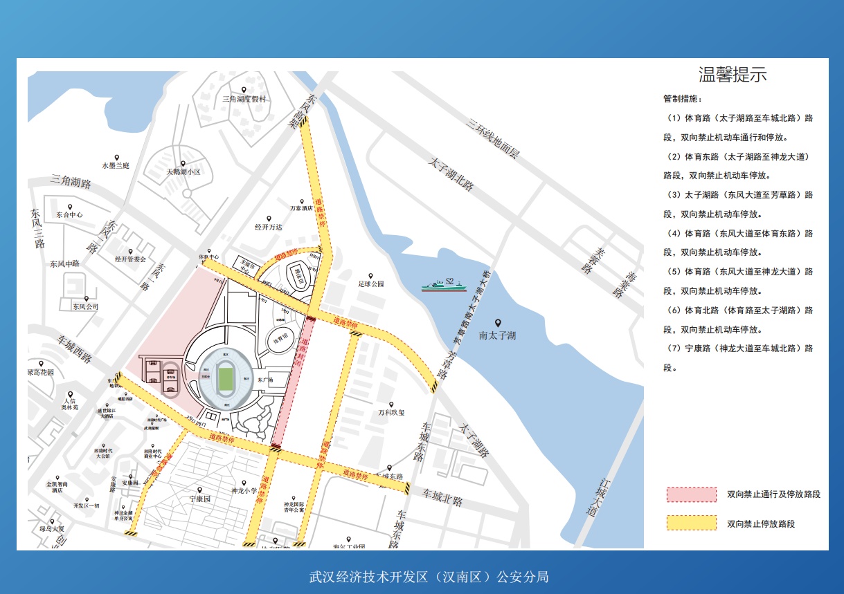 1.由于当天观众较多,体育中心周边道路车流增多,前往体育中心周边的人员请尽量错峰出行,高峰时段请做好出行规划,尽量避免进入体育路(东风大道至神龙大道)、太子湖路(东风大道至芳草路)、体育东路、车城北路(东风大道至车城东路)、宁康路路段。需通行该区域的人员或车辆,可选择绕行神龙大道、沌阳大道、太子湖北路、江城大道等外围道路。