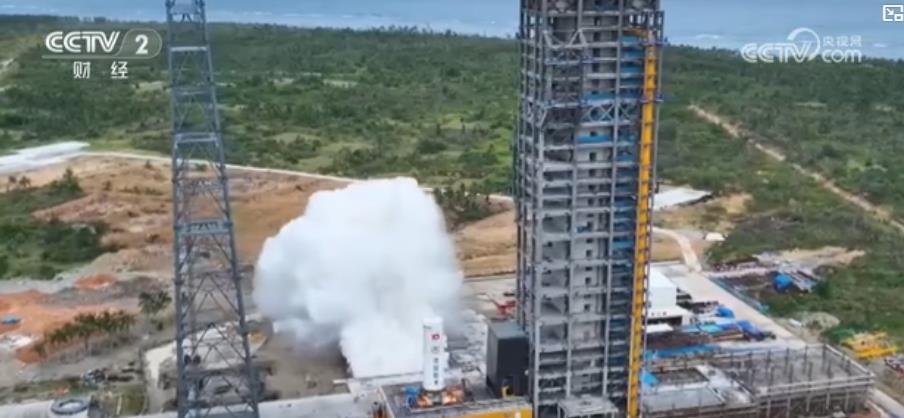 中国航天科技集团 彭越:开展动力系统试车是火箭在研制过程中非常关键的一环,它主要是要考核目前5米直径下安装7台发动机,多机并联的工况下的力热环境,以及箭上各个系统之间的工作匹配性的一个非常关键环节,也是释放将来飞行首飞风险的一个最重要的手段。