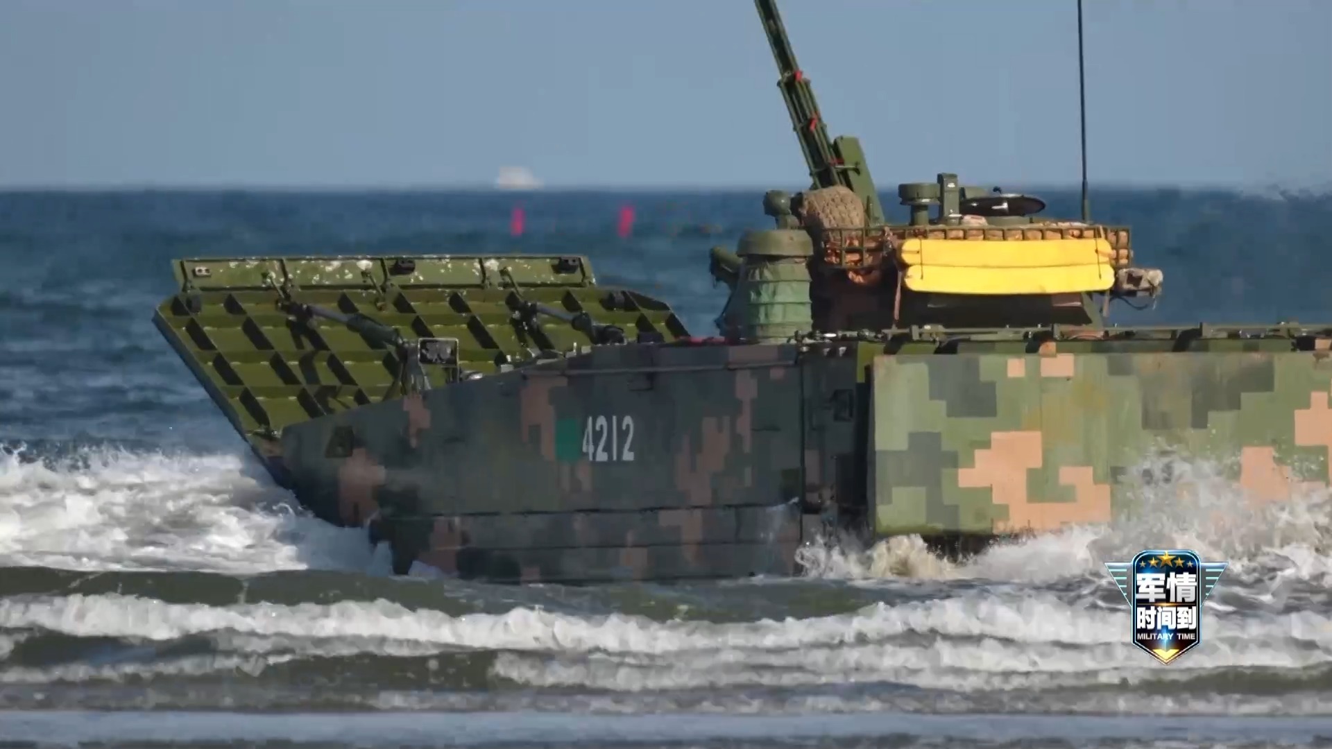 舰艇火控雷达快速对敌无人机机群完成锁定,多管30毫米近防炮开火,密集的弹雨织成一张无坚不摧的“火力网”,成功将敌无人机机群击落。如果说舰炮是撕开敌岸防工事的利刃,那么两栖装甲车的冲锋便是巩固胜利、向纵深推进的铁拳。