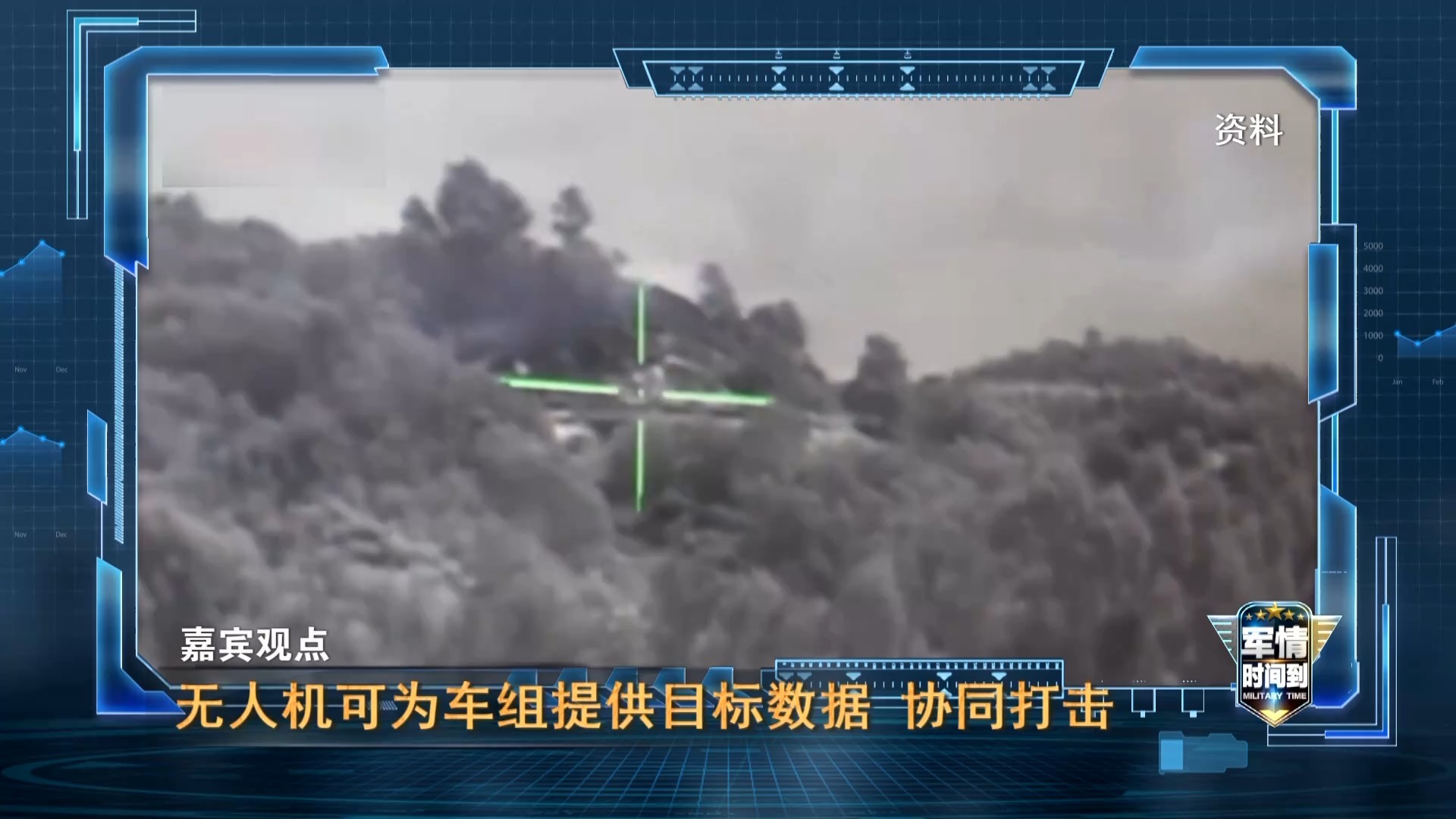 我们看画面,其中还有一架多旋翼的无人机。像这种无人机可以为车组提供更开阔的视野,可以观察到前方,为车组人员包括后方的指挥人员提供目标数据,协同车组人员对目标进行打击。