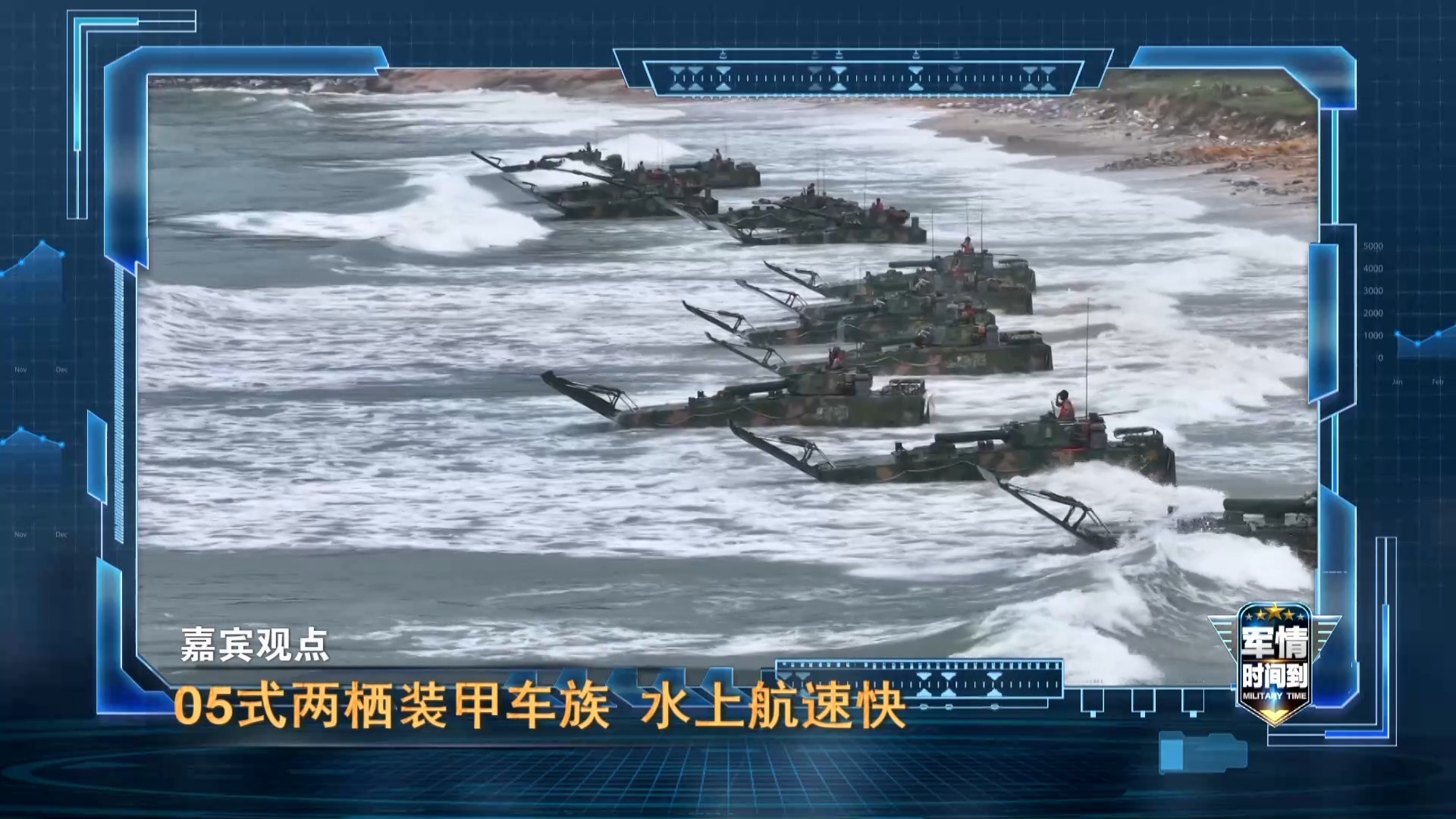 军事评论员 张学峰:从外形上来看,应该是属于咱们的零五式两栖装甲车车族。这个车有一个非常大的特点,就是它的水上航速非常快,应该说是目前世界上现役的两栖战车中航速最快的。你别看两栖战车总共也就20多吨,但是它的发动机的功率可能要达到一辆坦克的发动机的功率。既然车体那么先进、那么好,那么我们就在它的基础上通过更换不同的上装部分更换炮塔,让它发挥不同的作用。我们可以看到最基本型有两栖突击车,主要是用一门105毫米的火炮。而且它还有它的两栖步战车,搭载的一个炮塔比较小,使用的是30毫米机炮,而且可以搭载人员。还有两栖装甲人员运输车,主要进行人员和物资的运输,包括指挥车和工程抢救车等等。这样可以满足成编制的抢滩登陆,然后成编制形成战斗力。