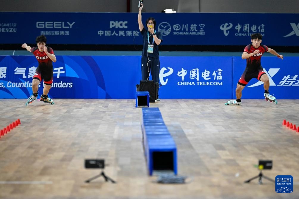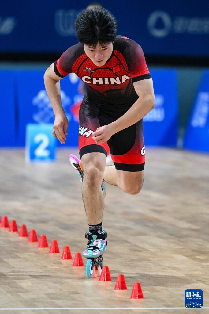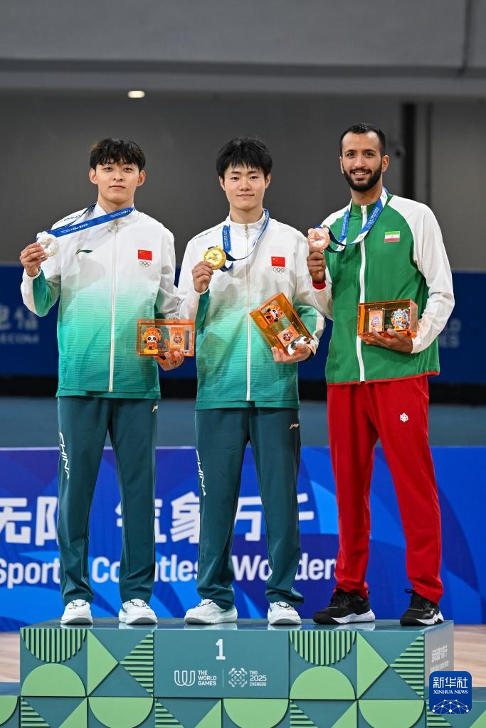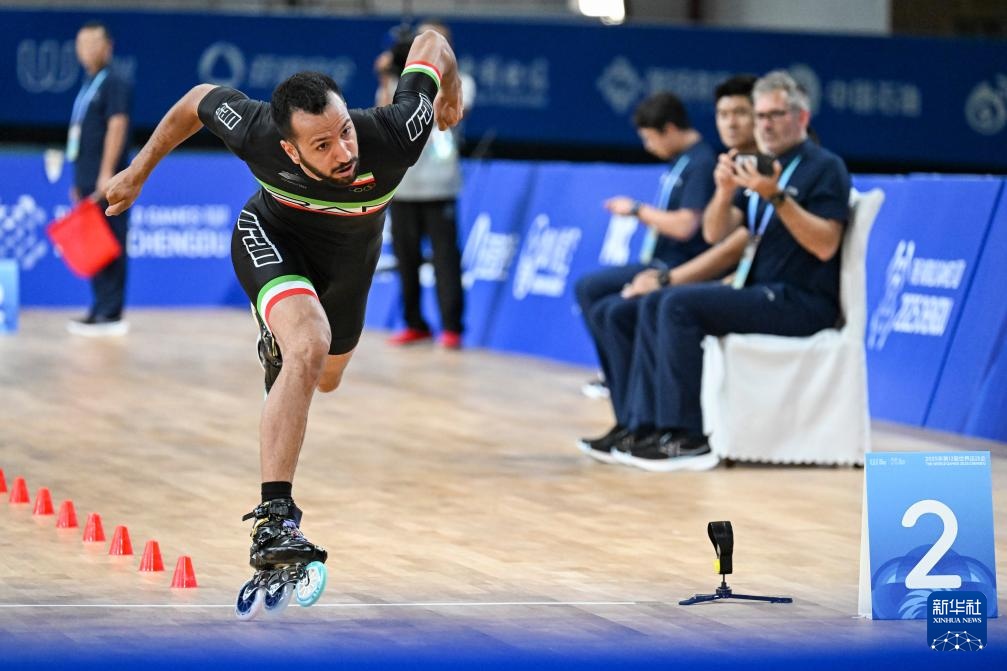 当日,在2025年成都世运会自由式轮滑男子速度过桩决赛中,中国选手张颢、付裕包揽冠亚军,伊朗选手莱萨尼获得季军。