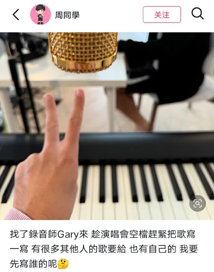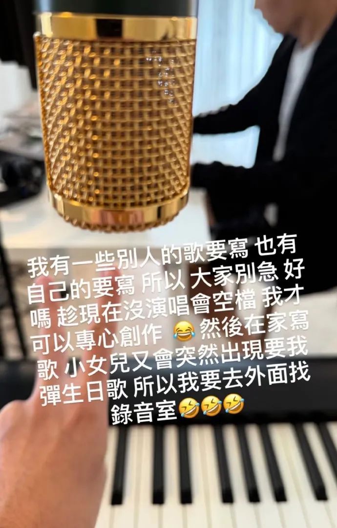 趁现在没演唱会空档,我才可以专心创作然后在家写歌小女儿又会突然出现要我弹生日歌,所以我要去外面找录音室。”