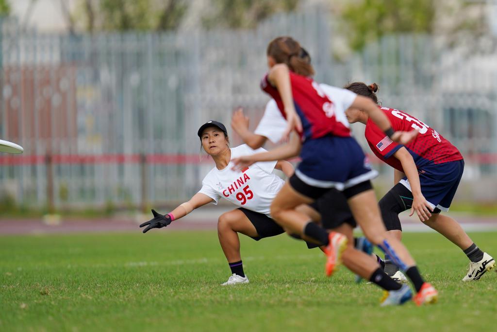8月14日,中国队选手李雪(左一)在比赛中。当日,在成都世运会团队飞盘预赛A组比赛中,中国队不敌美国队。新华社记者 崔文 摄