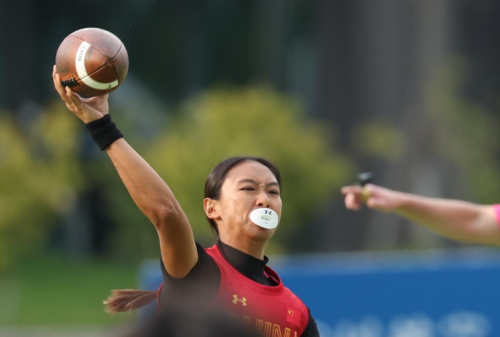8月14日,中国队球员冯浩霖在比赛中传球。当日,在成都世运会腰旗橄榄球女子预赛A组中,中国队不敌加拿大队。新华社记者 陈斌 摄