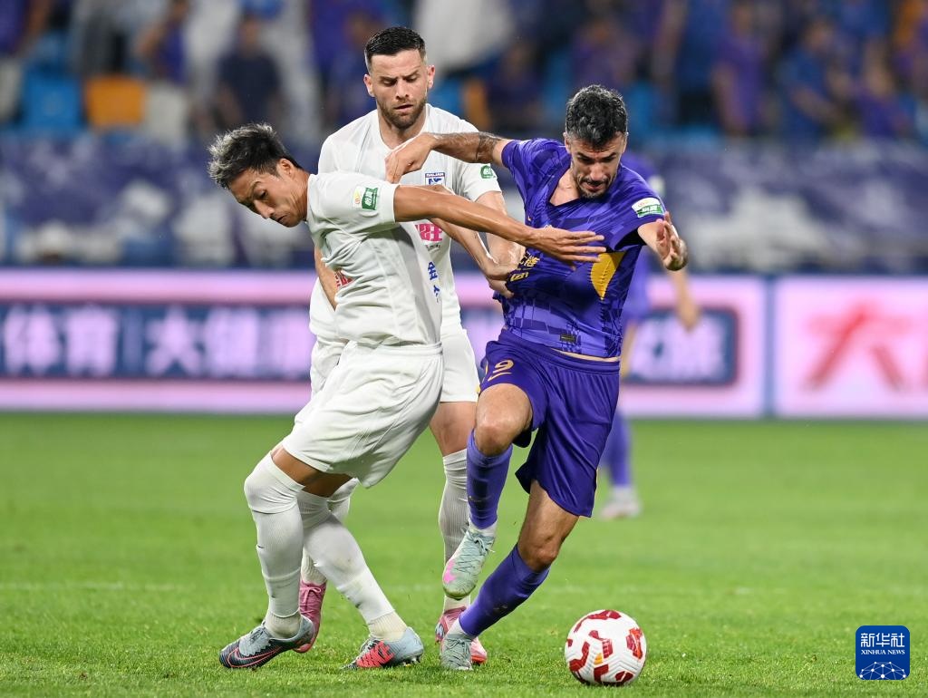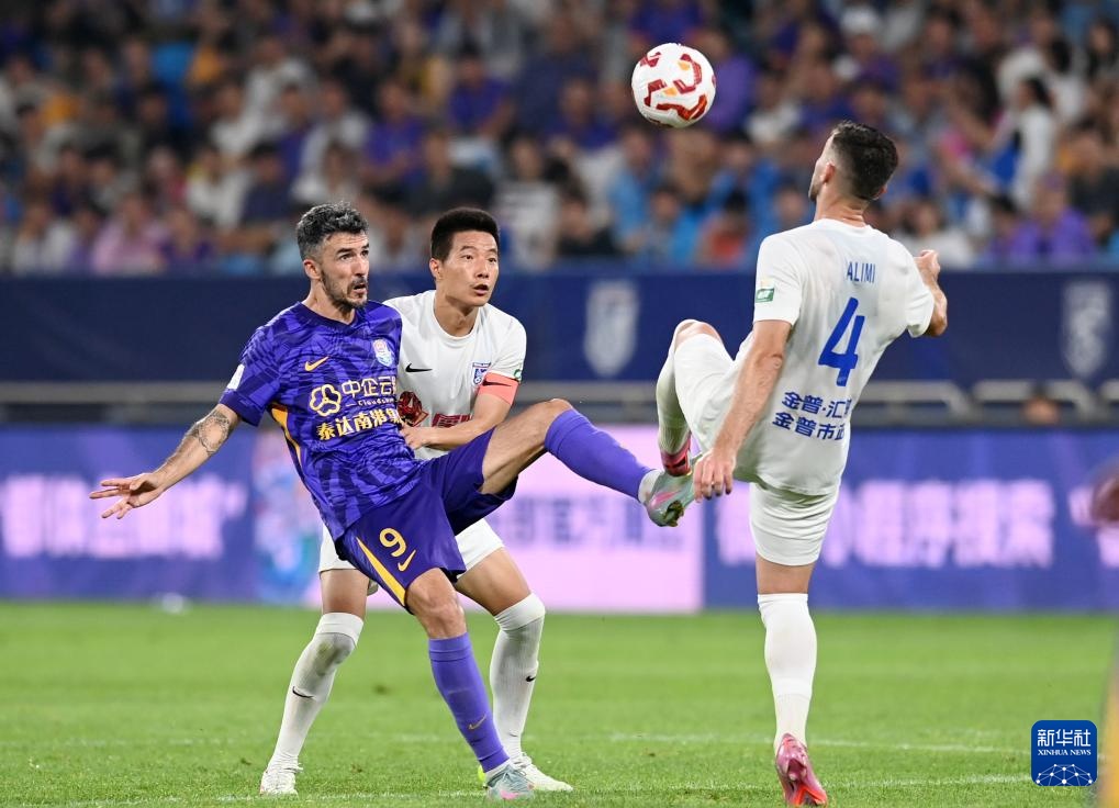 8月16日,天津津门虎队球员基莱斯(左)和大连英博海发队球员阿利米(右)在比赛中拼抢。