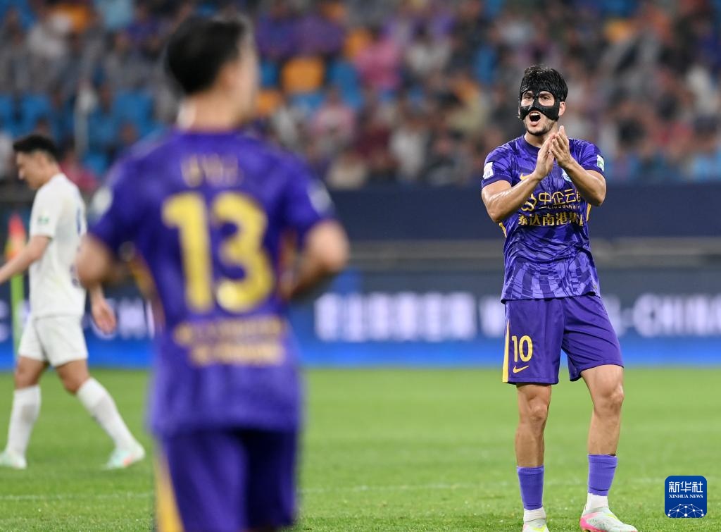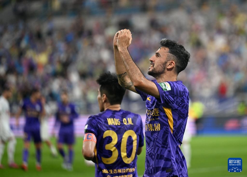 8月16日,天津津门虎队球员基莱斯(右)在进球后向球迷致意。