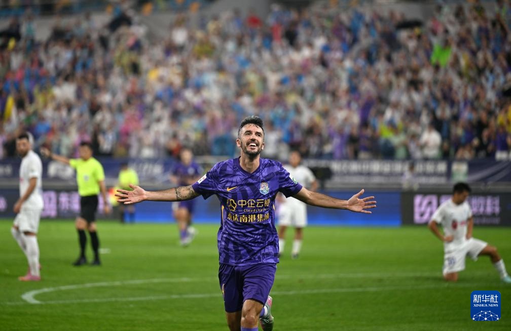 8月16日,天津津门虎队球员基莱斯在进球后庆祝。