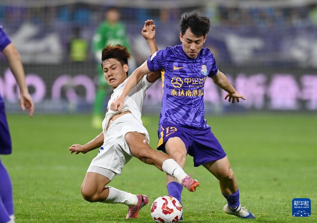 8月16日,天津津门虎队球员刘俊贤(右)和大连英博海发队毛伟杰在比赛中拼抢。