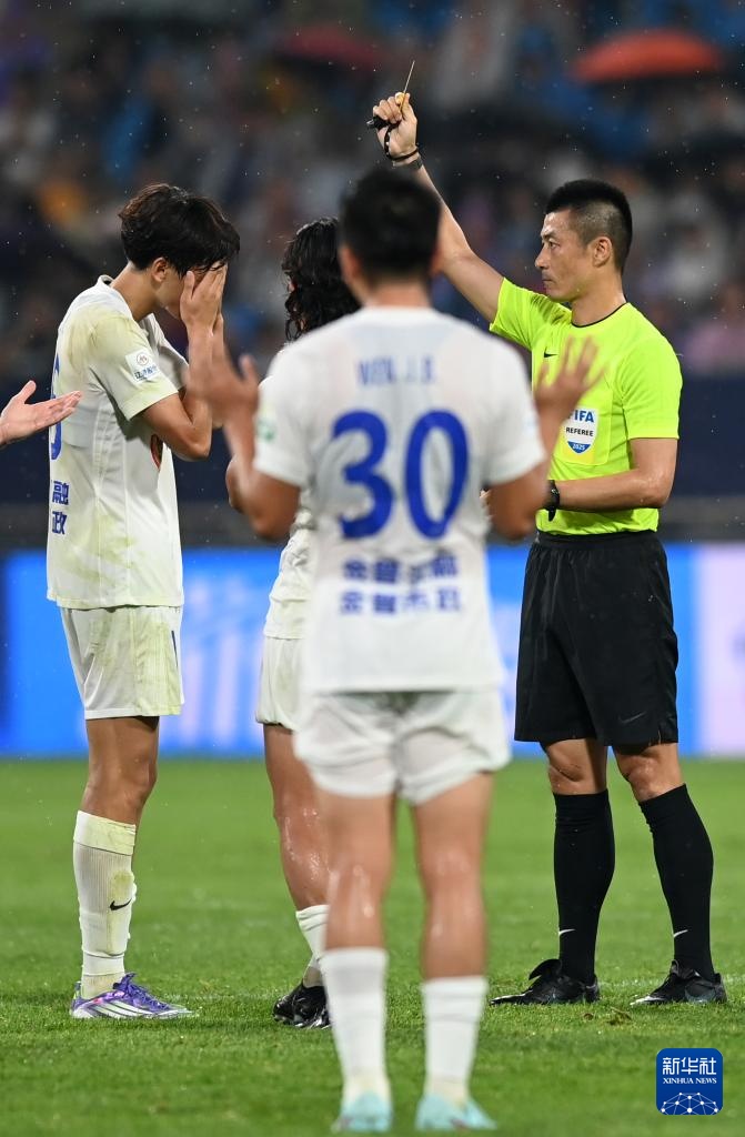8月16日,主裁判傅明向大连英博海发队球员朱鹏宇(左一)出示黄牌。
