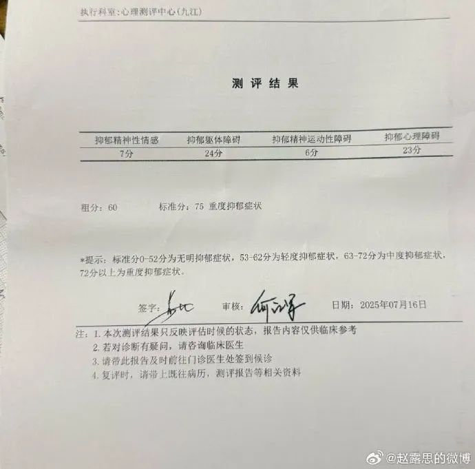 8月2日,赵露思发长文控诉经纪公司银河酷娱传媒,并晒出重度焦虑和抑郁测评报告。