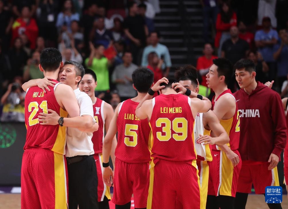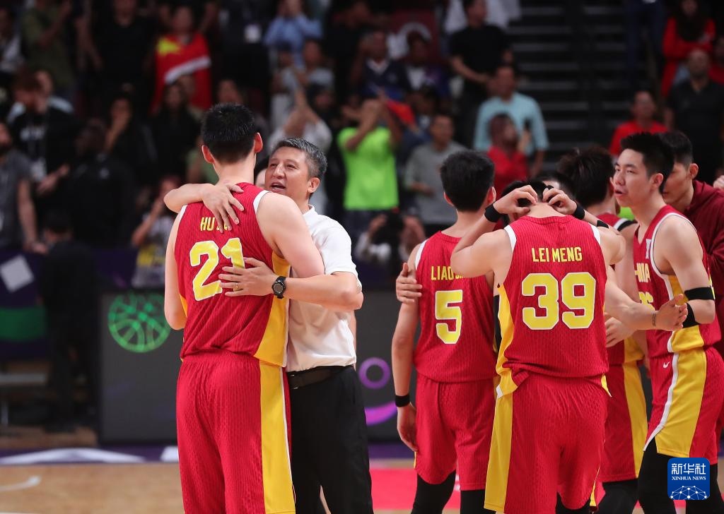 8月17日,中国队主教练郭士强(左二)赛后拥抱队员胡金秋。