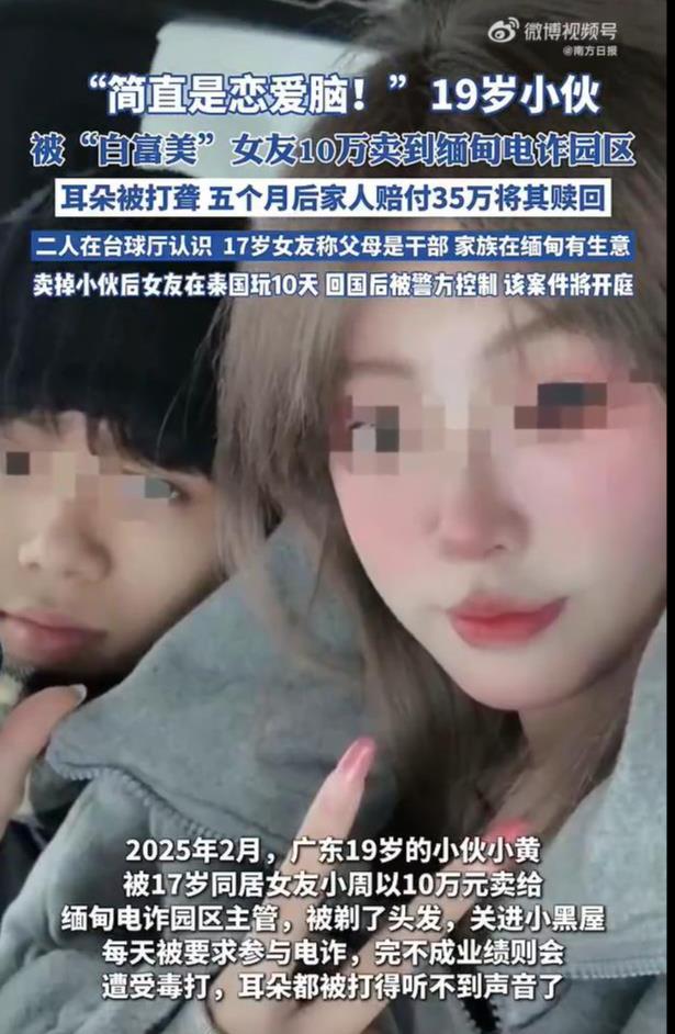 2025年2月,广东19岁的小伙小黄,被17岁同居女友小周以10万元卖给缅甸电诈园区主管,四个月时间里,小黄在电诈园区完不成业绩就会遭受毒打,耳朵都被打得听不到声音了。8月17日,记者联系到了小伙的姐姐黄女士,其讲述了弟弟被骗到缅甸的详细经历,她希望更多年轻人能够以弟弟为诫,提高警惕,避免被骗。(据8月18日南方日报)
