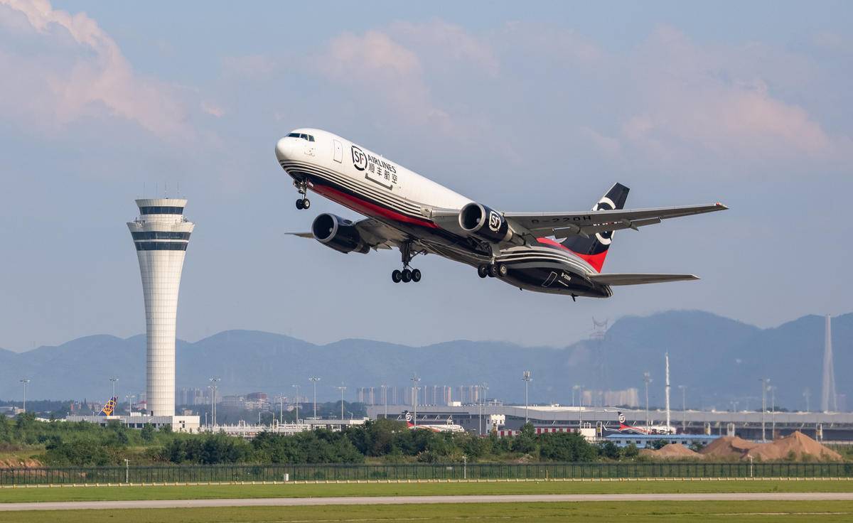 一架B767-300型全货机从鄂州花湖国际机场起飞,前往印度新德里。(湖北日报全媒记者 薛婷 摄)
