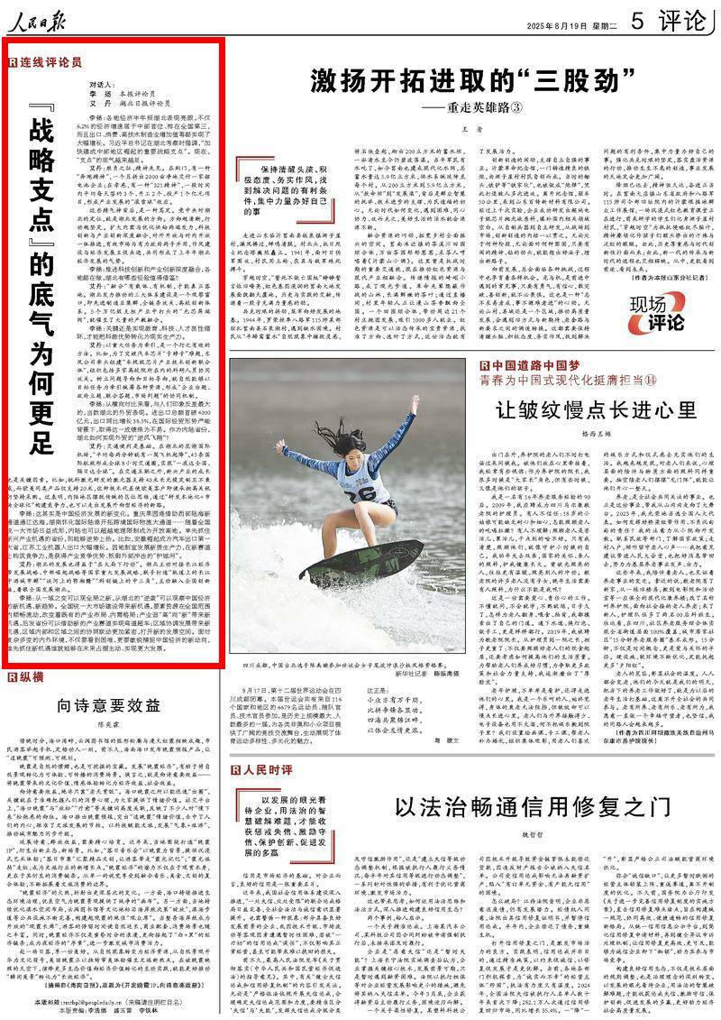 李拯:各地经济半年报湖北表现亮眼,不仅6.2%的经济增速居于中部首位、排在全国第三,而且出口、消费、高技术制造业增加值等都实现了大幅增长。习近平总书记在湖北考察时强调,“加快建成中部地区崛起的重要战略支点”。现在,“支点”的底气越来越足。